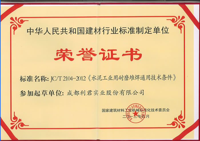 我公司榮獲“中華人民共和國建材行業標準制定單位榮譽證書”、常務副總經理徐智平先生獲得“JCT2104-2012《水泥工業用耐磨堆焊通用技術條件》行業標準起草人榮譽證書”、項目經理鄧四文先生被評為2012年度建材機械行業標準化先進工作者。
