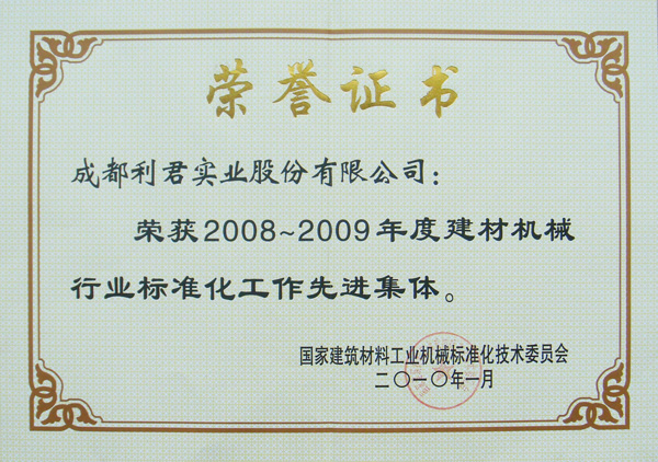 公司榮獲2008—2009年度建材機械行業標準化工作先進集體
