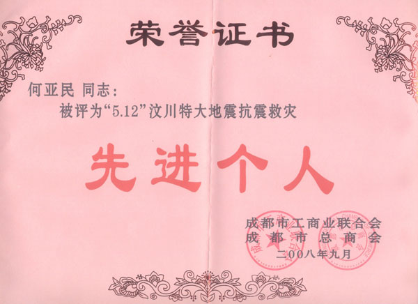 董事長何亞民被評為“5.12”汶川特大地震抗震救災先進個人