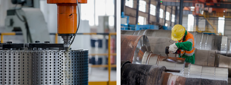 柱釘輥(發明專利號ZL201110263519.5)是利君自主開發研制的新一代輥面,由鍛造軸芯、特種合金復合輥套、耐磨硬質合金柱釘構成,其特點為: